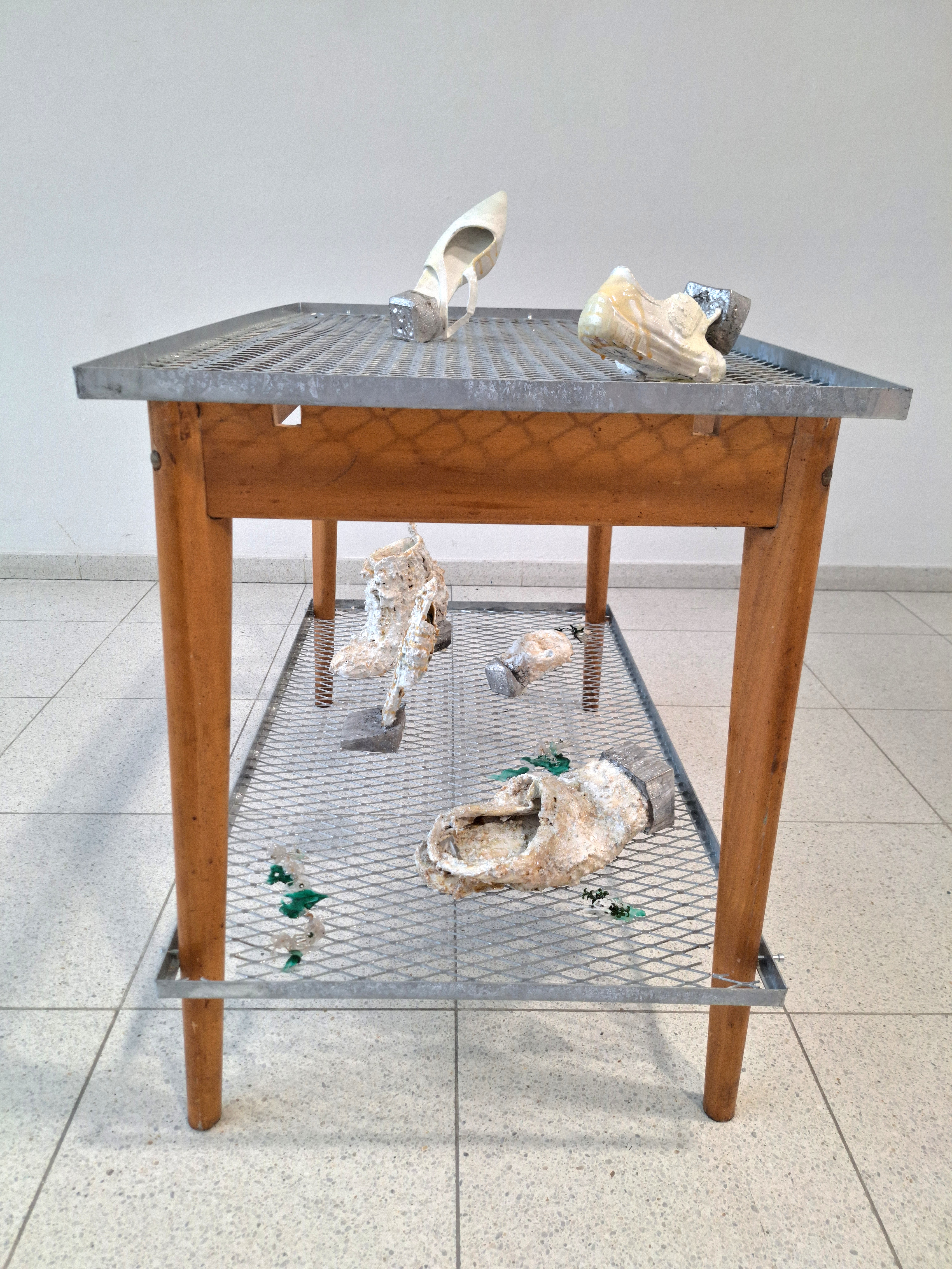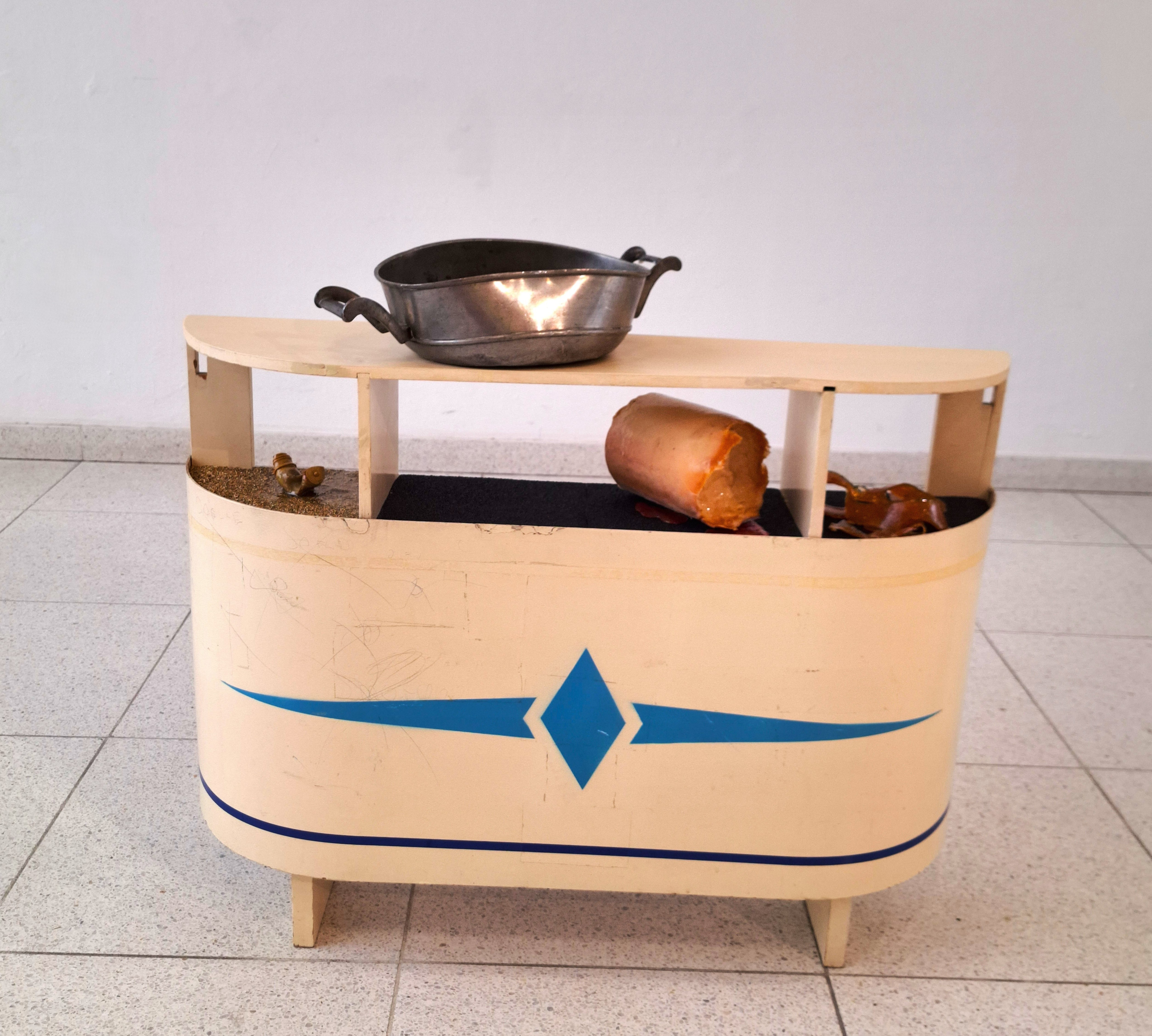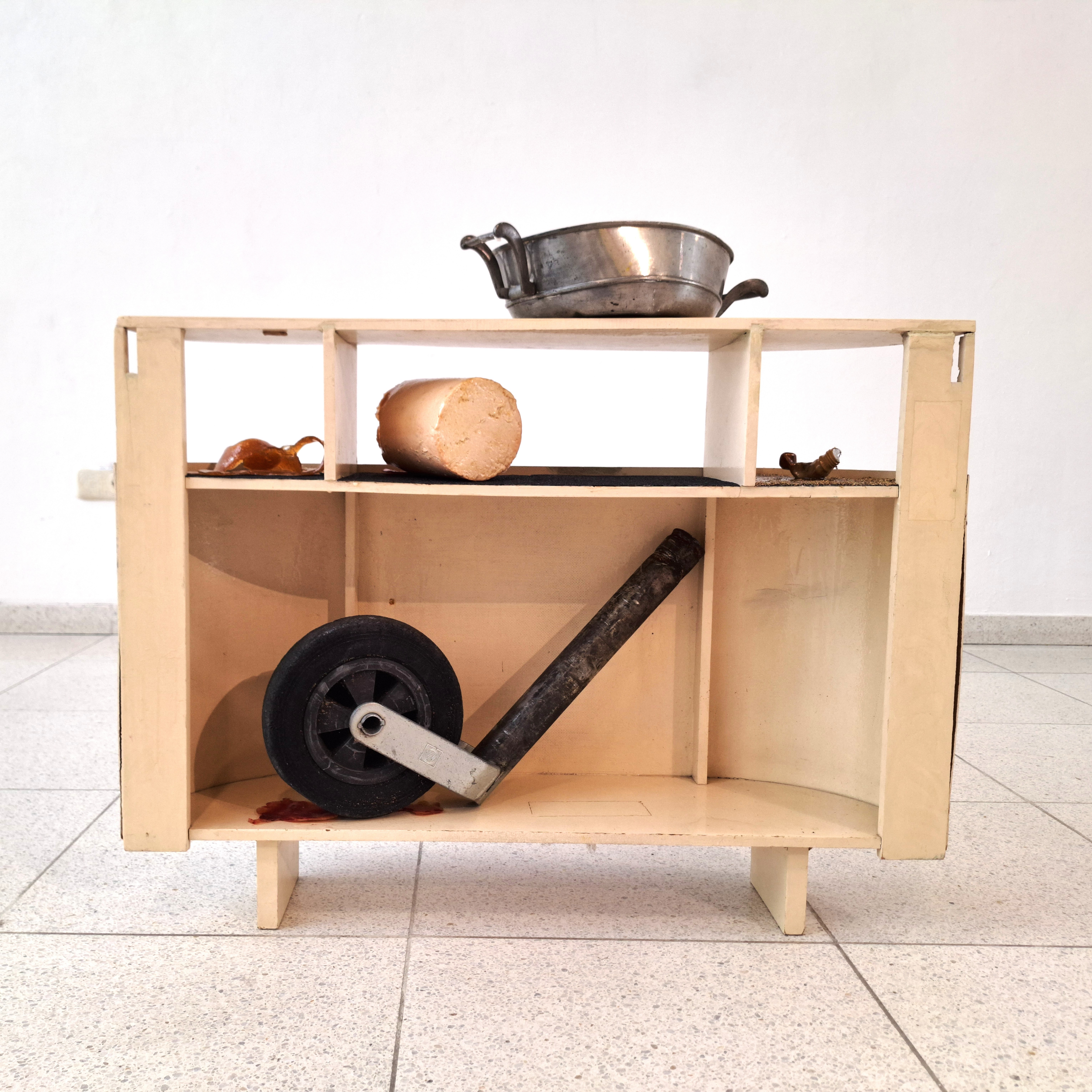 2025, Rauminstallation, Holz, Zinn, Metall, Mixed Media, HLB ca. 68 x 76 x 25 cm